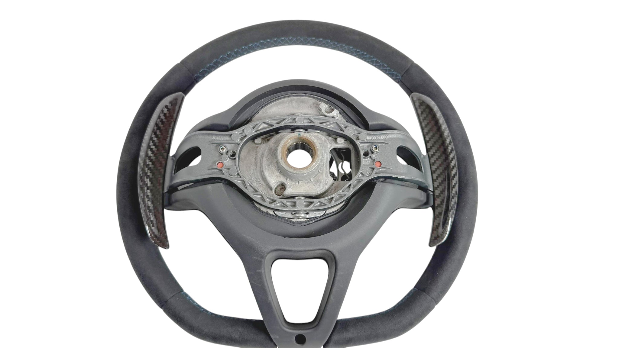 Mclaren 675LT/ 600LT MSO Carbon steering wheel. This is the rare MSO Option featuring full alcantara with blue stitching. The steering wheel comes with the MSO extended paddles and all in gloss carbon.
